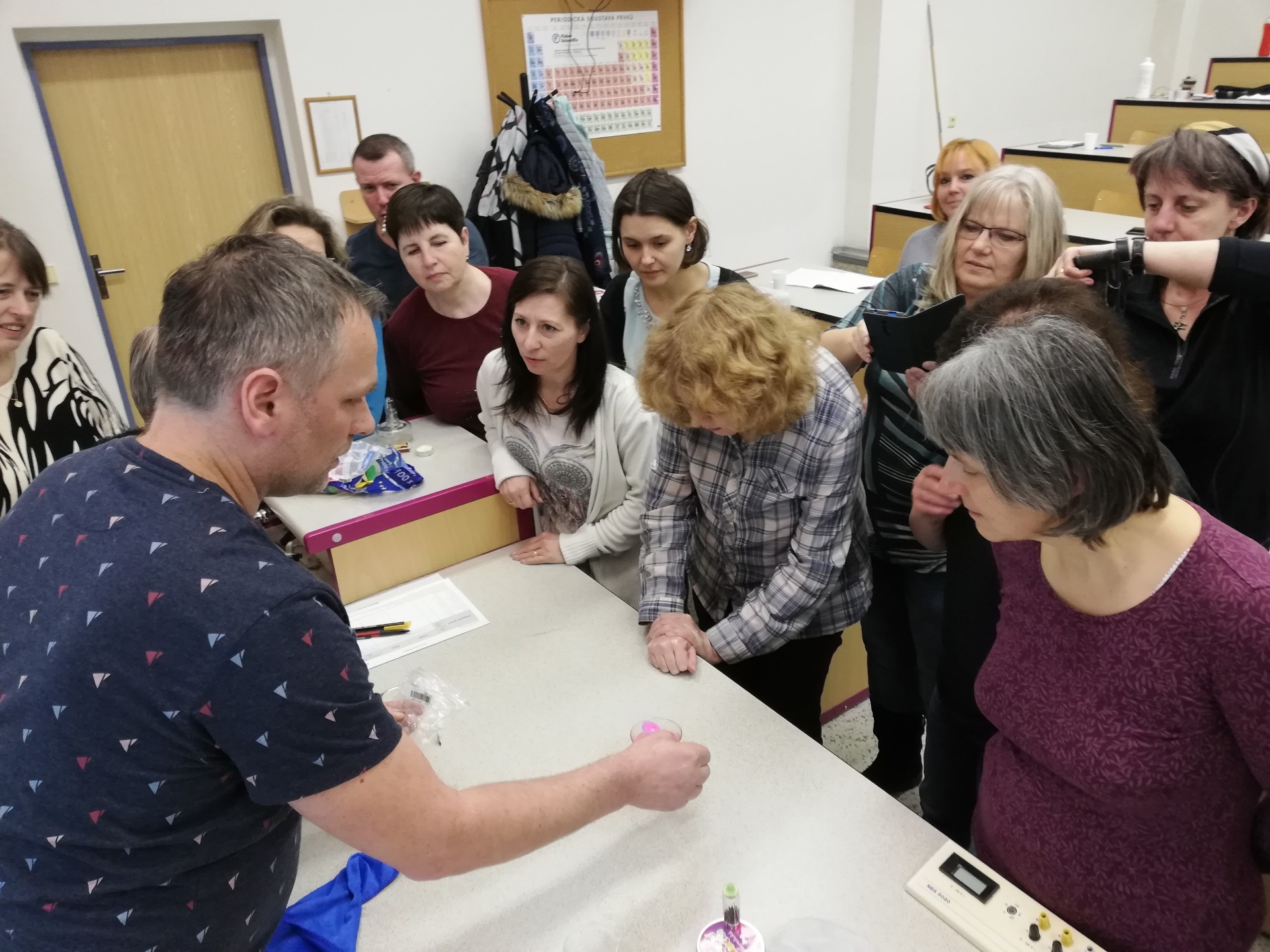 Jako každý rok i letos se sešla spousta nápadů, o které se podělili samotní účastníci setkání. Nejprve jsme si zapojili několik elektrických obvodů se stavebnicemi Boffin - např. jsme se naučili používat fotorezistor na automatické ovládání světla (třeba pouliční lampy). Dále jsme obdivovali nesmáčivý písek, drát s tvarovou pamětí, ferrofluid a Woodův kov (skoro jako lžičky z NDR ;-)). Potom jsme sledovali akusticky vyladěný Galileův padostroj vlastní výroby. Na řadu přišlo využití rozšířené reality v matematice a fyzice, některé aplikace jsou dostupné i pro Android. Nakonec jsme viděli opravdu velký kus smolince a proměřili jej měřidlem dávky záření od SÚRO a zbrusu novým přírůstkem do našeho balíčku pomůcek - měřidlem radioaktivity od Verniera. Spektrometr jsme z časových důvodů museli odložit až na další setkání...